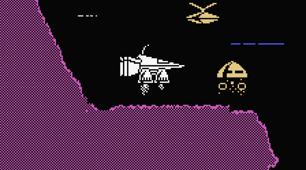 In Cyberun you pilot a ship and must fly around a large scrolling landscape, shooting continually-respawning enemies, looking for lost pieces of your ship. And once you have those you then need to find eight parts of a rocket that will finally allow you to escape the planet.