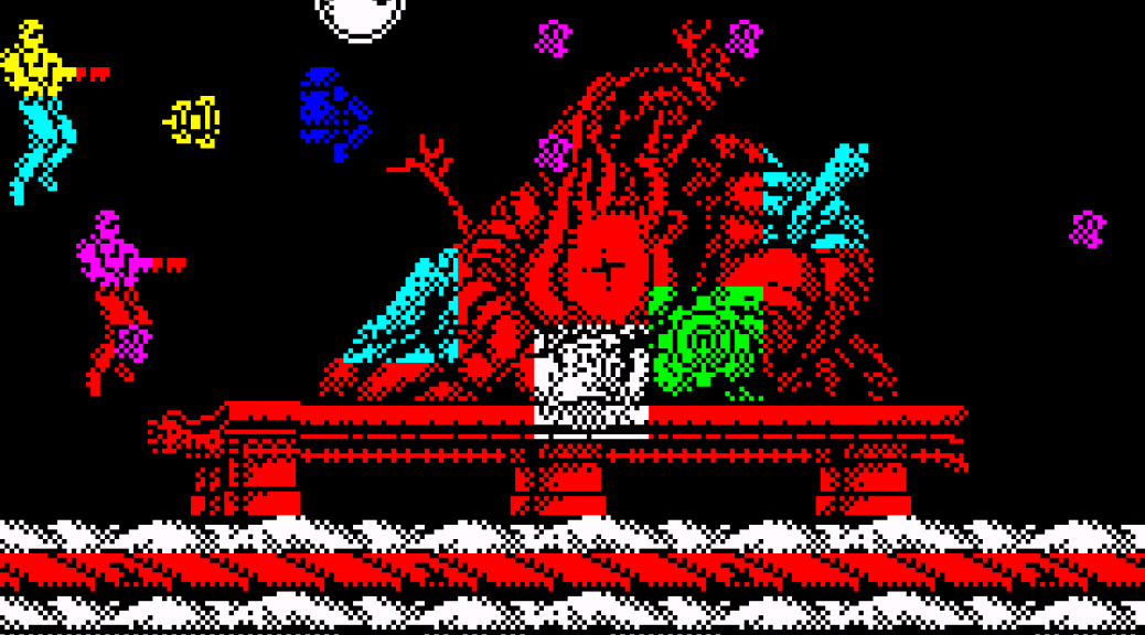 The Spectrum port has got excellent presentation, graphics, and sound, and decent playability. The bug-fixed disk version (by “SG-Team“) is the one to find and play.