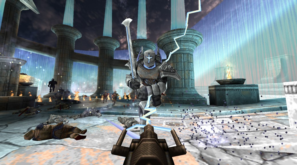 Take “Tears of the False God“, for example, which is a stunning multi-layered floating castle in the sky, with beautiful waterfalls and alcoves. The problem, though, is that it is populated by a metric fucktonne of enemies, so you don’t get much time to admire the scenery. And, like the best Quake maps, it really is a work of pure evil, with its tricks, traps, high difficulty, and surprise Shamblers… The aim in this special level is to collect nine Hallowed Shards. Unfortunately, each is guarded by a new type of knight that can jump and throw napalm at you. And they really take some putting down, so it’s something of a boss battle, taking one on. And you’ve got nine to defeat… Followed by an epic final boss battle!