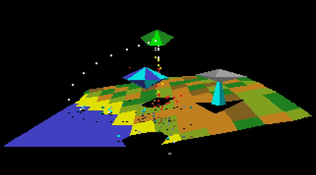 Geoff Crammond‘s The Sentinel (aka The Sentry in North America) is a strange chess-like game where you have to sneak up on an overseeing watcher, who is perched high on a platform, overlooking the play area, and absorb him before he does the same to you.
