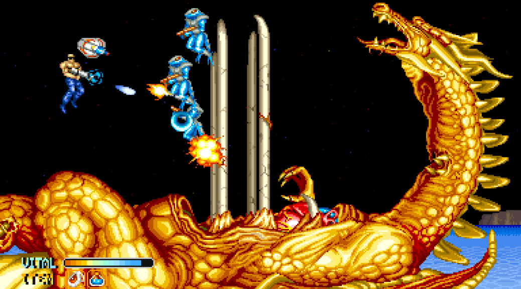 Forgotten Worlds is a classic Capcom arcade shooter from 1988, with simultaneous two-player coop, a rotational aiming system, and intense bullet hell action set across a landscape of the desolate Earth in the 29th Century.