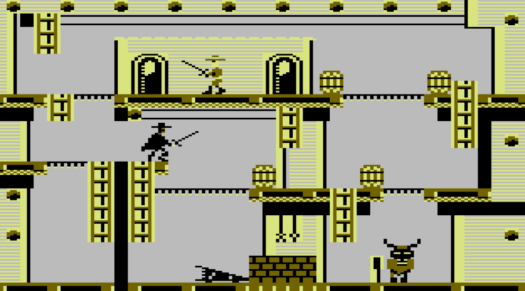 Zorro (Spanish for ‘fox’) is an 8-bit platform game developed by Datasoft and published by US Gold in 1985. It was written by James Garon, with graphics by Kelly Day, and is based on a fictional character created by American writer Johnston McCulley.